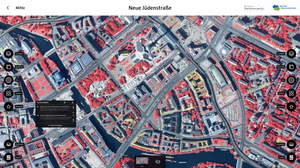 Zusammen mit den Berliner Wasserbetrieben und der Berliner Regenwasseragentur haben wir einen Prototyp des digitalen Planungstabels entwickelt. Auf dem Multitouch-Tisch können Maßnahmen zur dezentralen Regenwassernutzung kollaborativ, effektiv und transparent geplant werden. Zukünftig werden auch Simulationsmodelle wie ein Wasserhaushaltsmodell integriert. In diesem Zusammenhang wurde die Simulation von Verkehrsströmen bereits als Beispiel dienen. Die digitale Planungstabelle wird dazu beitragen, gemeinsam mit der Stadtverwaltung, den Planern und den Grundstückseigentümern eine wassersensible und klimaangepasste (Schwamm-) Stadtentwicklung für Berlin sicherzustellen.