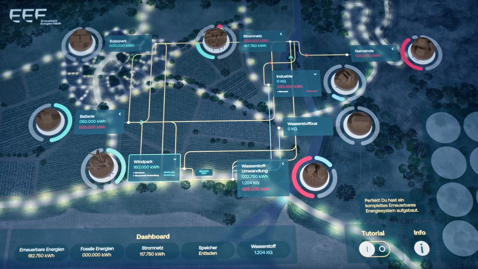 Um die Kommunikation mit ihren Stakeholdern zu unterstützen, beauftragte EEF uns mit der Entwicklung einer maßgeschneiderten, interaktiven Version unseres Commune S Table – für den Einsatz im Showroom und auf Messen. Ziel war es, das Verständnis für komplexe hybride Energiesysteme auf eine spielerische und leicht zugängliche Weise zu fördern.