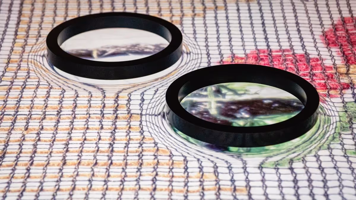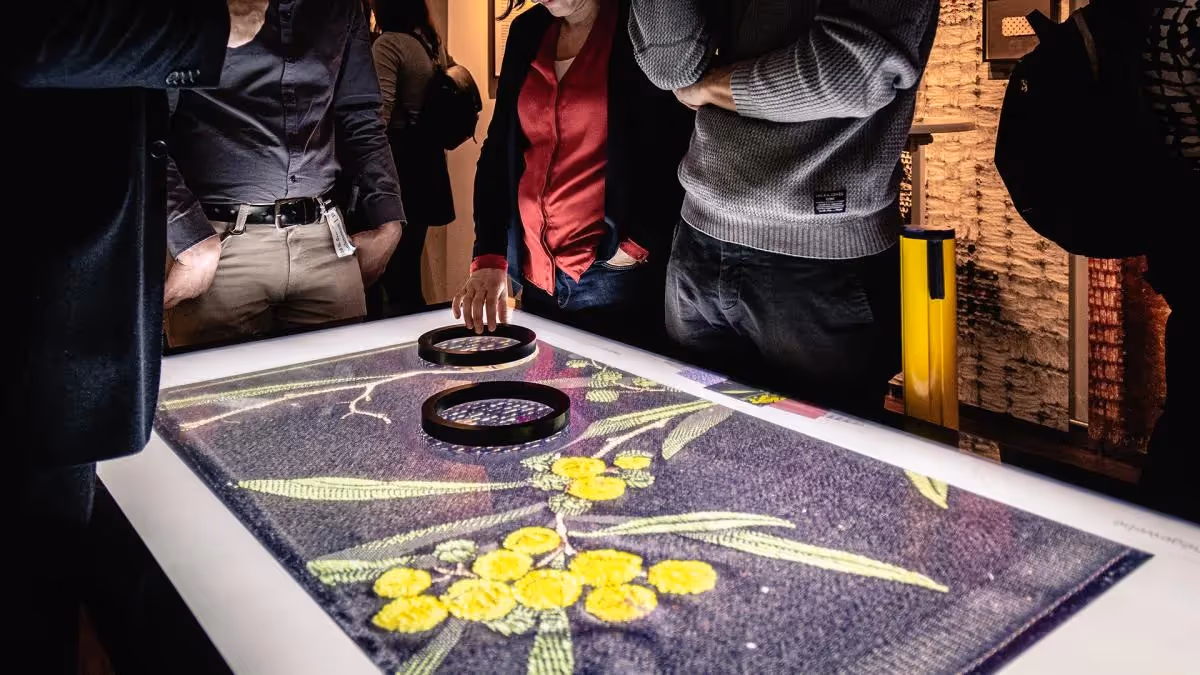 Einzigartige und originale Stoffmuster aus den Jahren 1885 bis 1937 werden durch hochauflösende Detailaufnahmen auf großformatigen Bildtafeln ergänzt, die die komplexe Farb-, Struktur- und Mustervielfalt der einzelnen Exponate visuell hervorheben. Die Hightech-Vergrößerungsgläser, die frei auf dem Tisch platziert werden können, ermöglichen es den Besuchern, durch intuitives Drehen in die Stoffmuster hineinzuzoomen. Besucher können tief in die verschiedenen interessanten und kuriosen Muster der Textilmuster eintauchen, um immer neue Details zu entdecken.