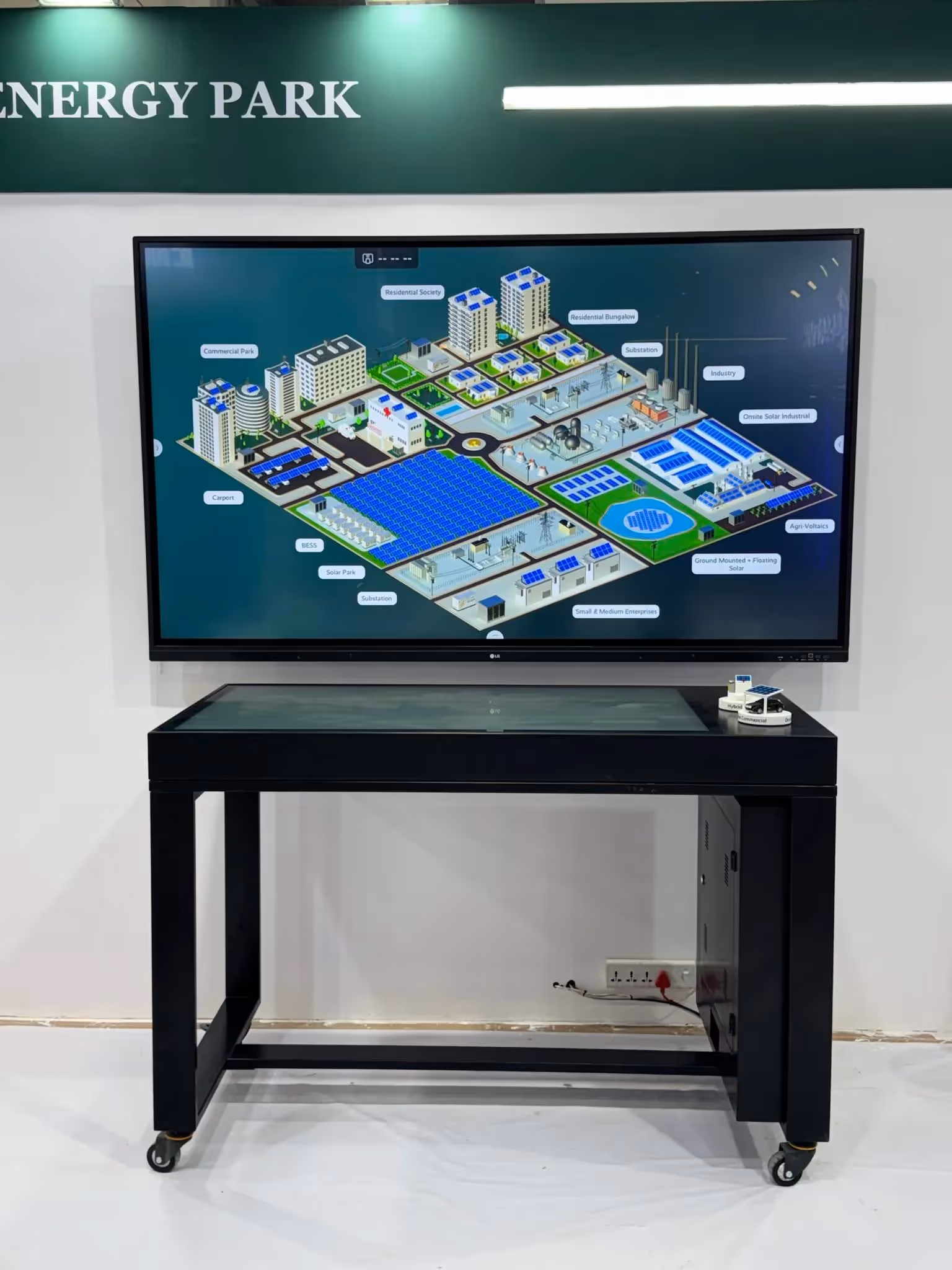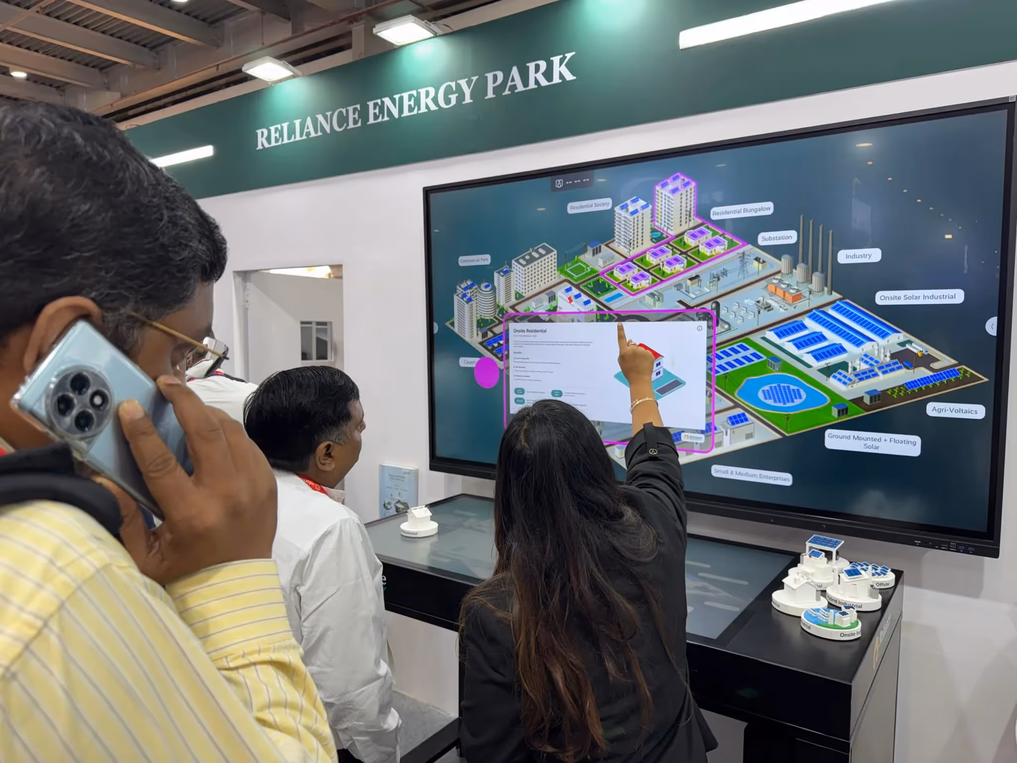 Mithilfe des Interactive Scape Object Recognition Table entwickelte und baute DVSI die digitale Reliance City, die die transformative Rolle der Solarenergie in den Bereichen Wohnen, Gewerbe und Industrie demonstriert. Physische, maßstabsgetreue Modelle, die jedes Anwendungsbeispiel repräsentieren, wurden auf dem Bildschirm des Tisches platziert und lösten dynamische Interaktionen aus, die verschiedene Teile der digitalen Stadt hervorhoben. Durch eine benutzerdefinierte Benutzeroberfläche konnten Besucher jedes Anwendungsbeispiel im Detail erkunden und die Möglichkeiten erneuerbarer Energien hautnah erleben.