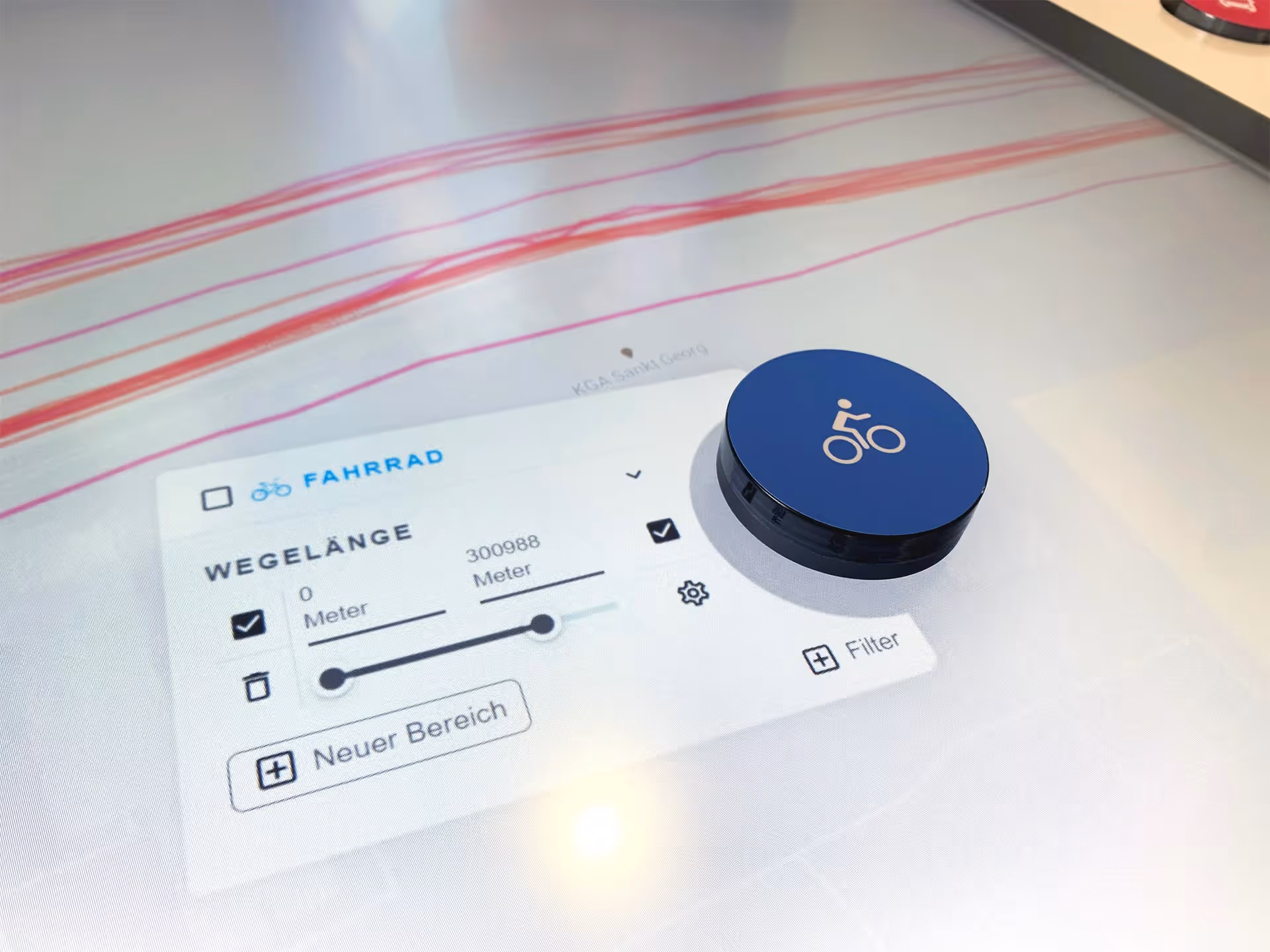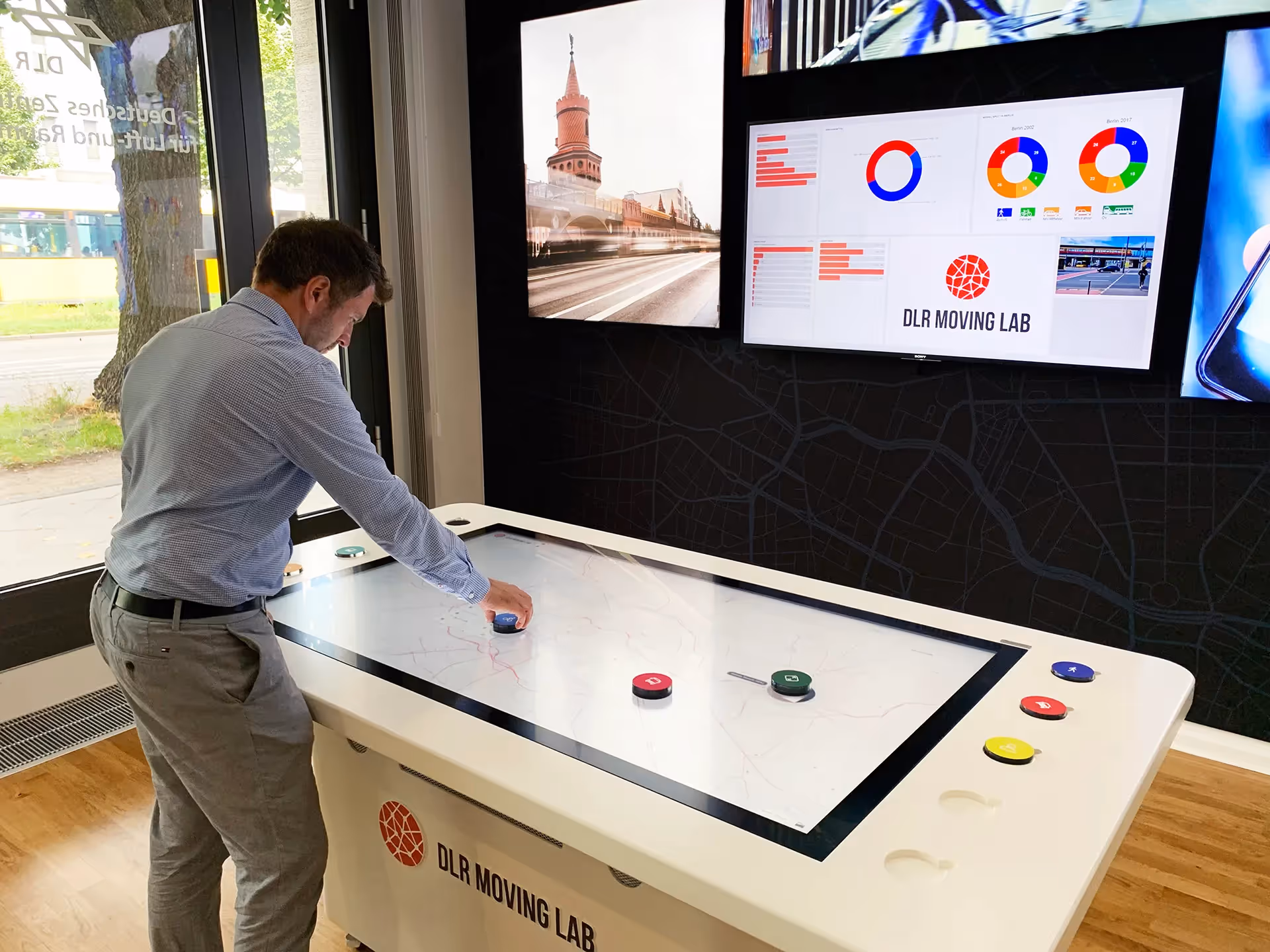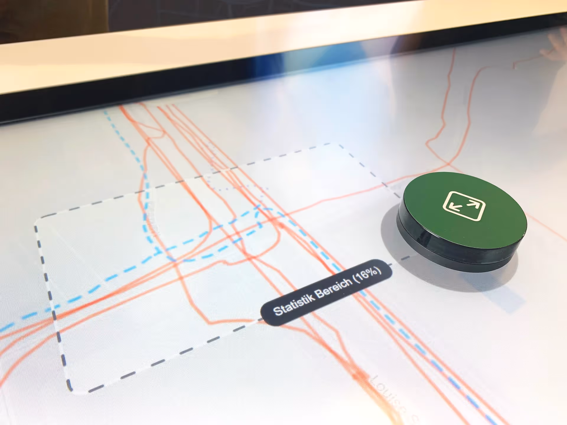 In collaboration with the DLR MovingLab team, an application has been developed that opens up entirely new possibilities for the analysis and exploration of mobility patterns and behaviors using objects. This allows millions of route data to be visualized, interactively analyzed, and diverse real-time statistics to be generated. Through a proprietary CMS, any datasets can be imported, and all routes can be displayed on a map. By rotating and moving tangibles, precise areas on a map can be defined, which are then evaluated through a second screen in the form of statistics.
