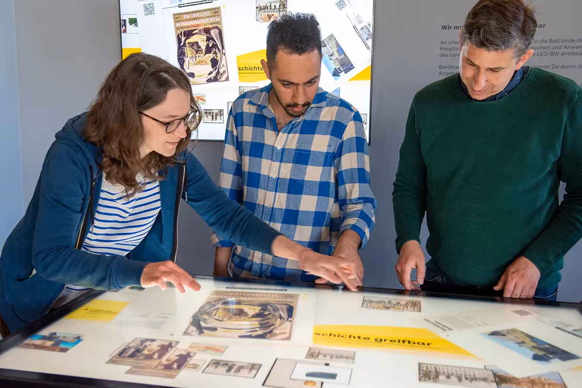 In the course of redesigning the foyer of the headquarters in Stuttgart, the State Archives of Baden-Württemberg decided to employ a new method of cultural communication by introducing a multitouch media table. In close collaboration with the development team from Interactive Scape, custom software was created for the 55-inch touch screen of the accessible table. This software allows visitors to explore selected archival materials from the institution in a continuous flow. In addition to items from the Hauptstaatsarchiv, the table also features 3D models and various historical maps from the Baden-Württemberg regional knowledge portal LEO-BW, which can be freely rotated and zoomed in on through touch, providing a completely new experience compared to the portal's web offering. Using the table's object recognition, visitors can filter the digital copies by themes using category markers or use the ring-shaped magnifying glass to enlarge specific details, providing another tactile and playful way to interact with the objects.
