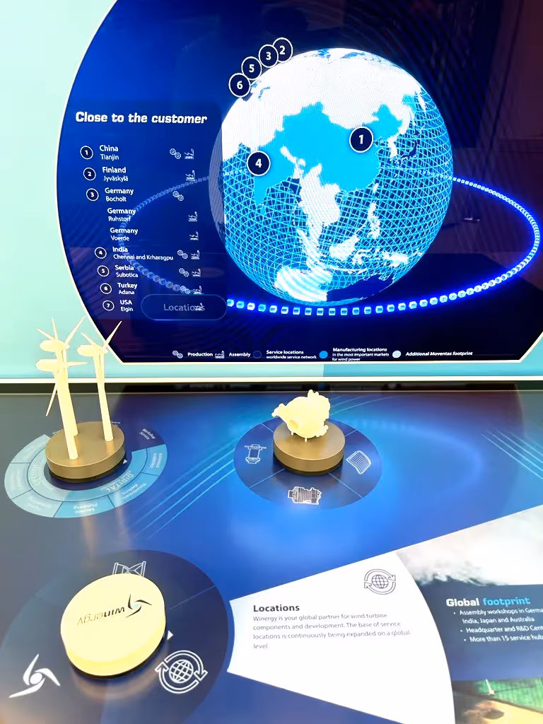 Winergy's innovative solutions are showcased through an interactive table coupled with a vertical screen, adding a dynamic dimension to their presentation. A key feature is the windmill-token, enabling users to rotate a 3D windmill model 360 degrees in real-time by turning the token, providing an engaging, panoramic experience. This interactive scenario seamlessly integrates various Winergy solutions and services. Additionally, the exhibit offers in-depth presentations about Winergy's global headquarters, its rich history, and their comprehensive range of windmill solutions, all in an engaging and interactive format.
